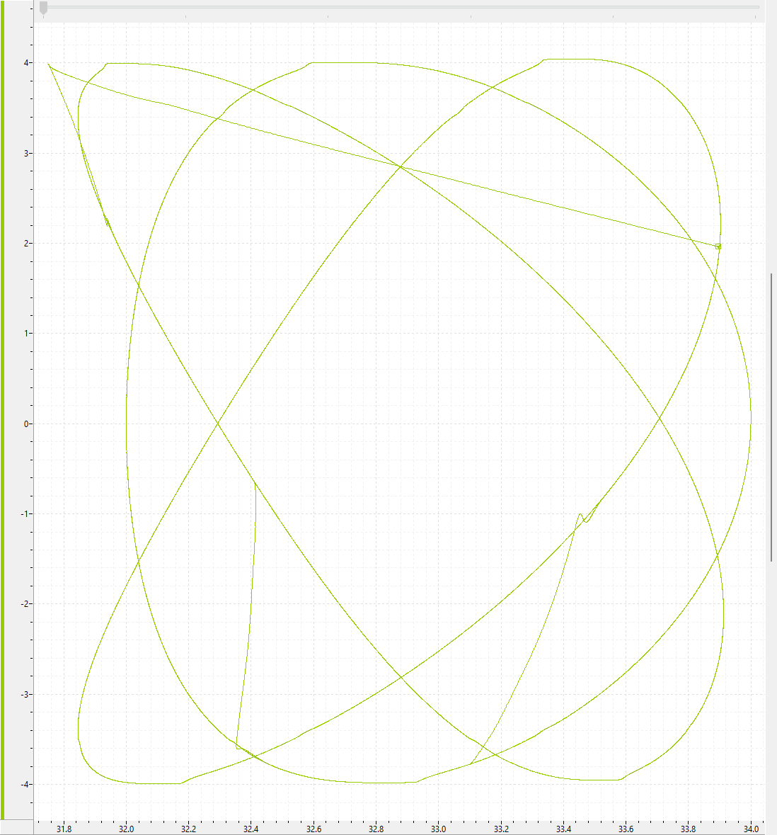 XY plotting can be very useful to view the resulting motion. Below is a plot with a varying phase between axis A and axis B. This was captured using the XY Plot defined in the project and running the ExampeMoves program.