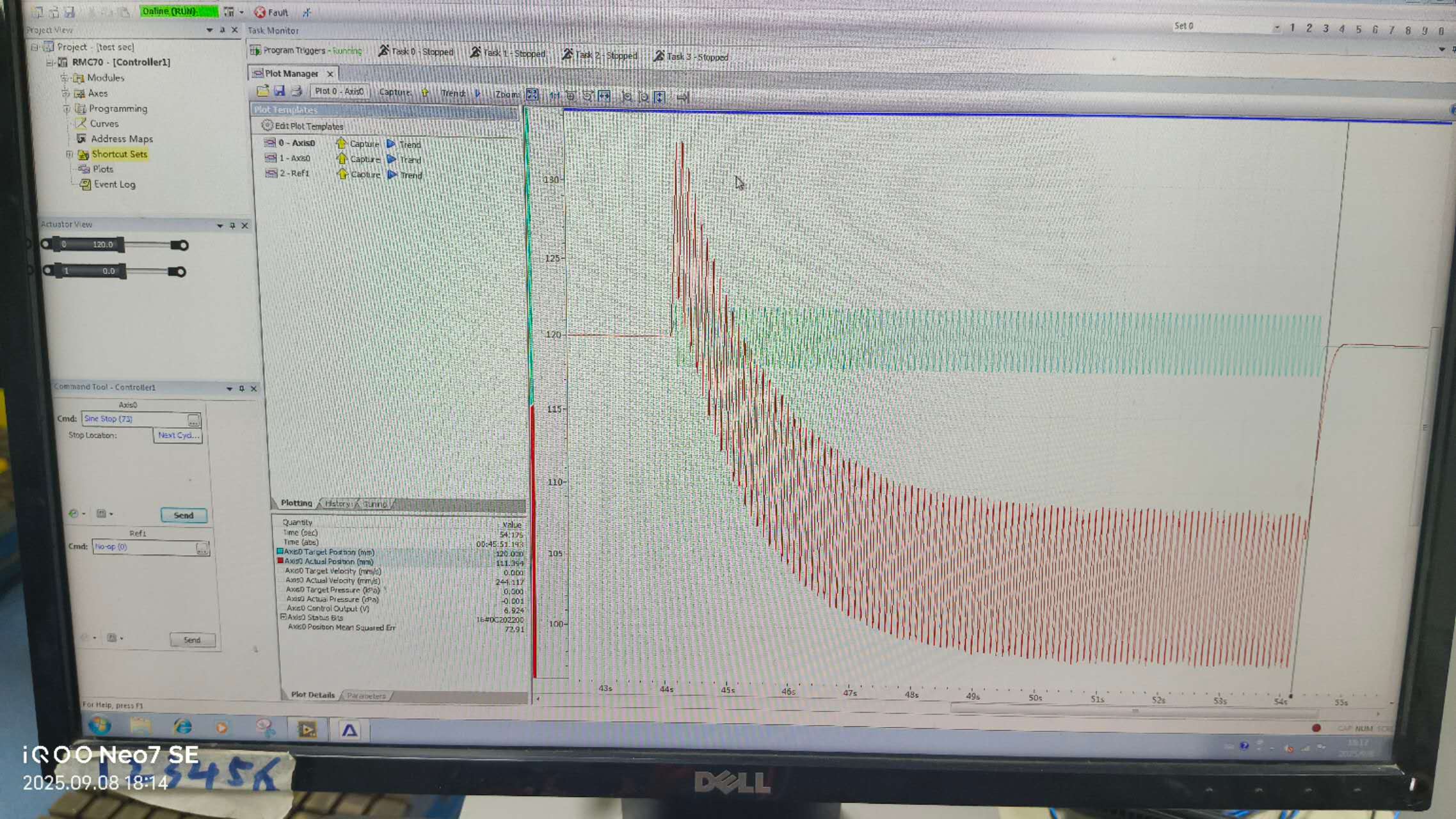 I want to generate a vibration signal with 30Hz frequency and 1mm amplitude for the RMC75E using LabVIEW. When I tried to generate this signal with the MOVE ABSOLUTE and MOVE ADDITIVECOMMAND, the maximum achievable frequency was only 4Hz. Additionally, when I attempted to generate the signal using SINE START, no signal was output.