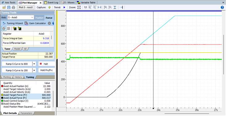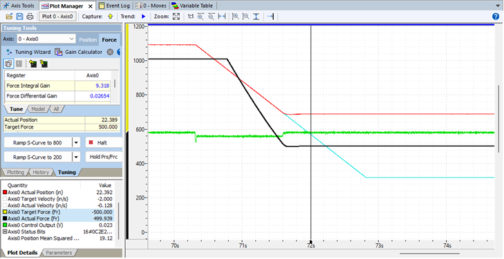 Notice in the Plot Details window that the Target Force is -500. The Target Position starts at a high value, and moves in the decreasing direction. As the Actual Force approaches 500, it is limited, which is also evident by the Actual Position coming to a stop.